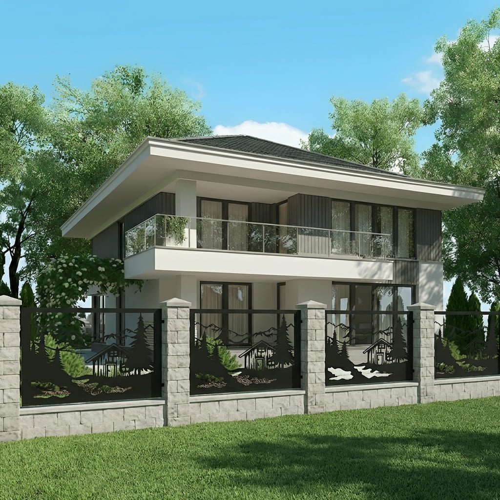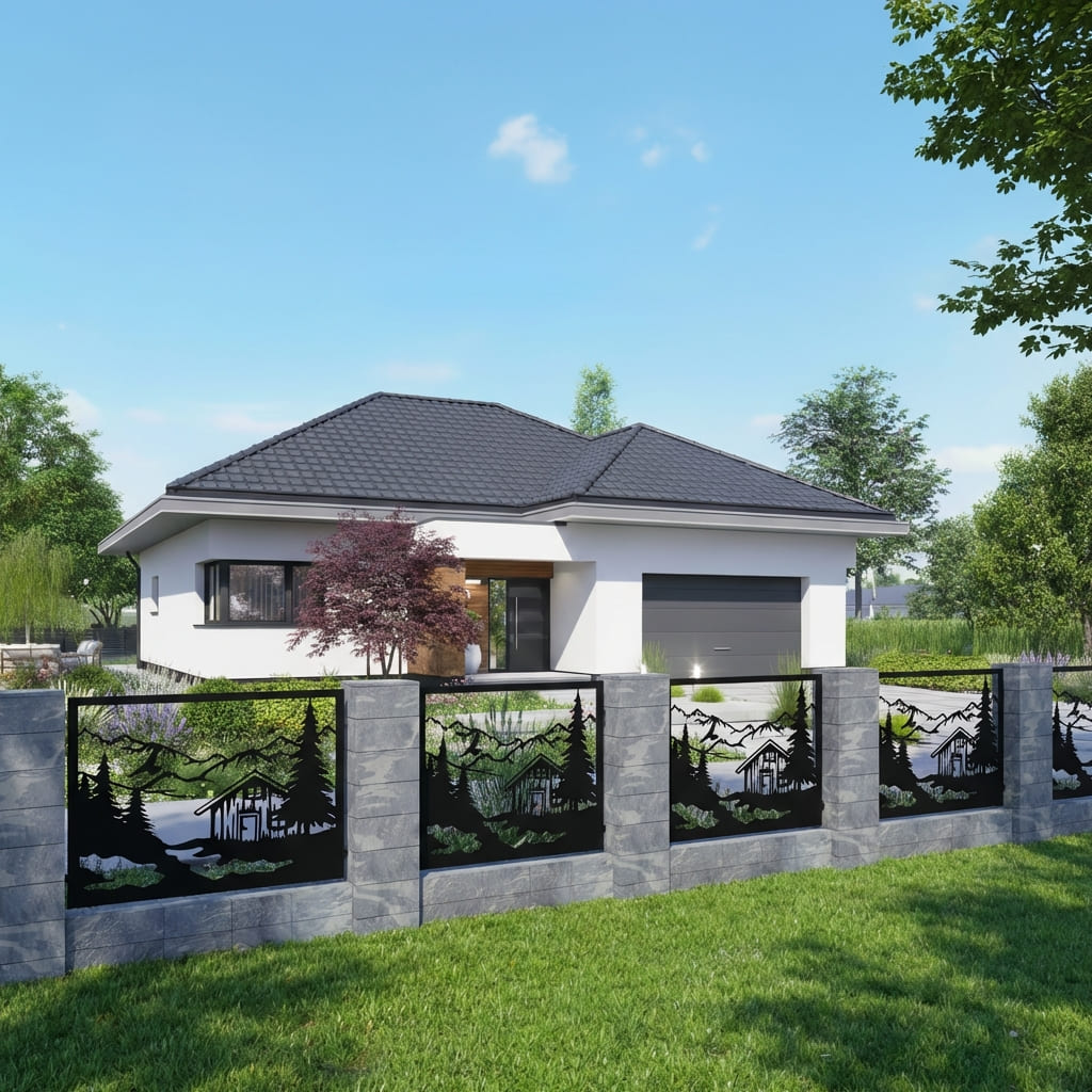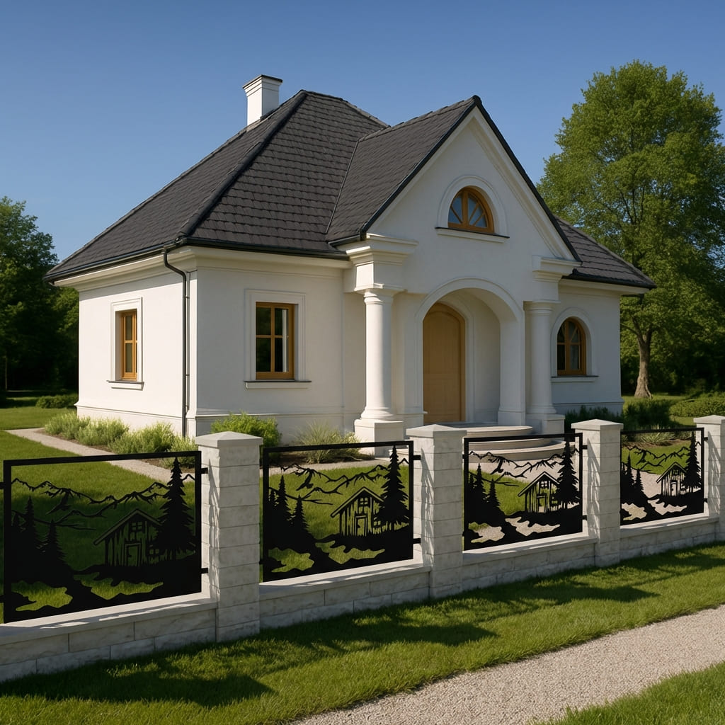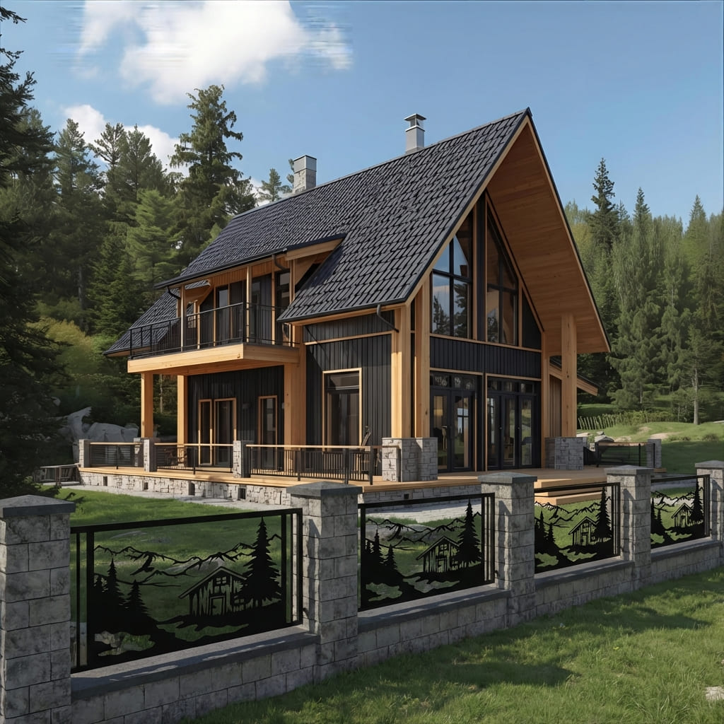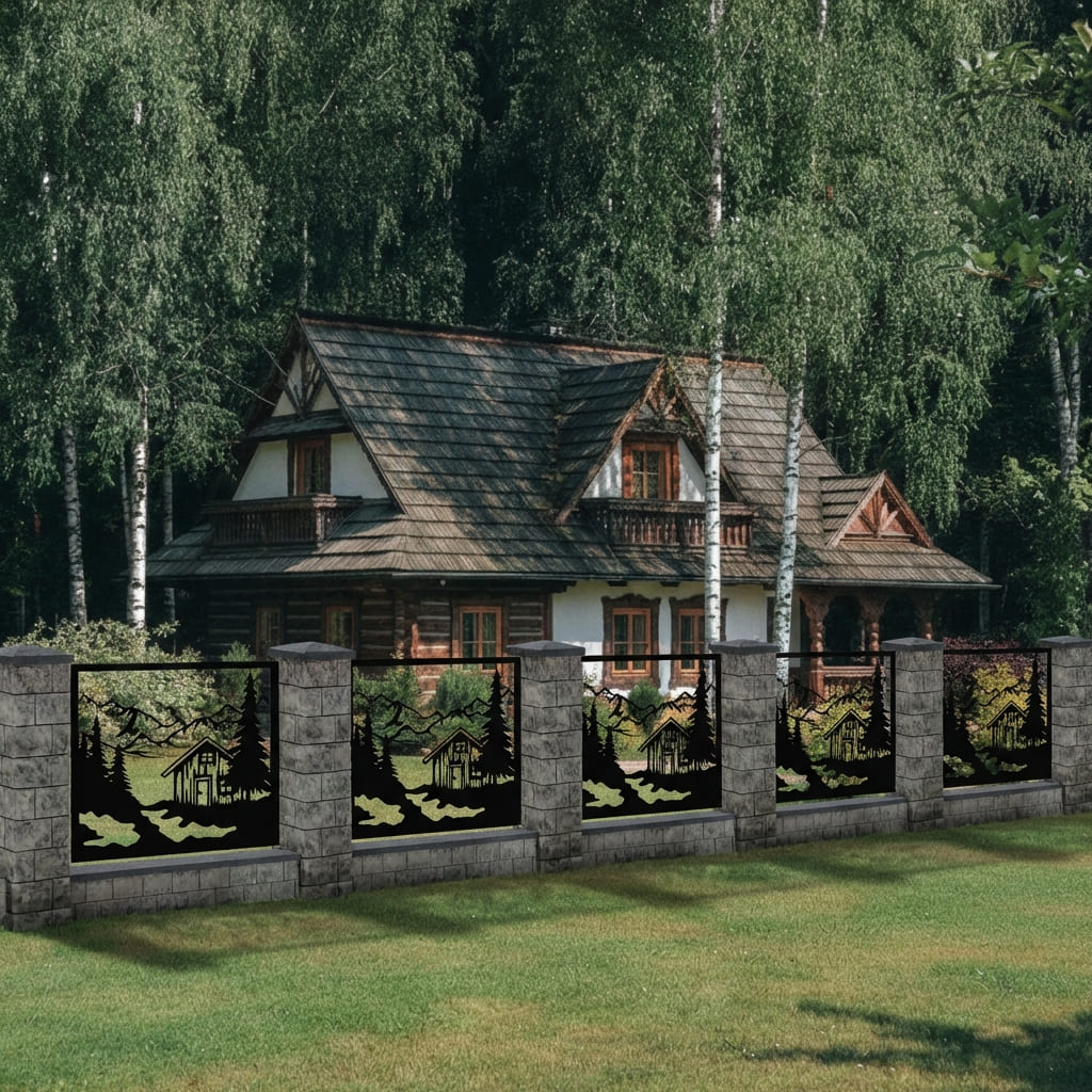 Panel Ogrodzeniowy Metalowy – Motyw Krajobrazowy (Górska Chata) – Wzór "3049" – Kolekcja Natura – Na Wymiar