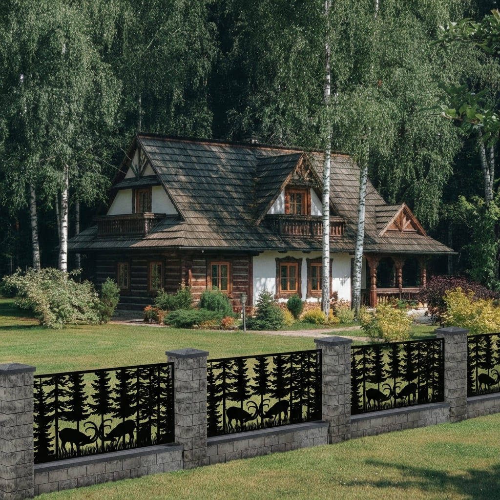 Panel Ogrodzeniowy Metalowy – Bogaty Motyw Leśny ze Zwierzętami – Wzór "2027" – Cięcie Laserowe na Wymiar