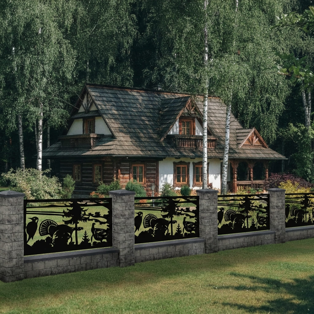 Panel Ogrodzeniowy Metalowy – Bogaty Motyw Leśny ze Zwierzętami – Wzór "2071" – Cięcie Laserowe na Wymiar