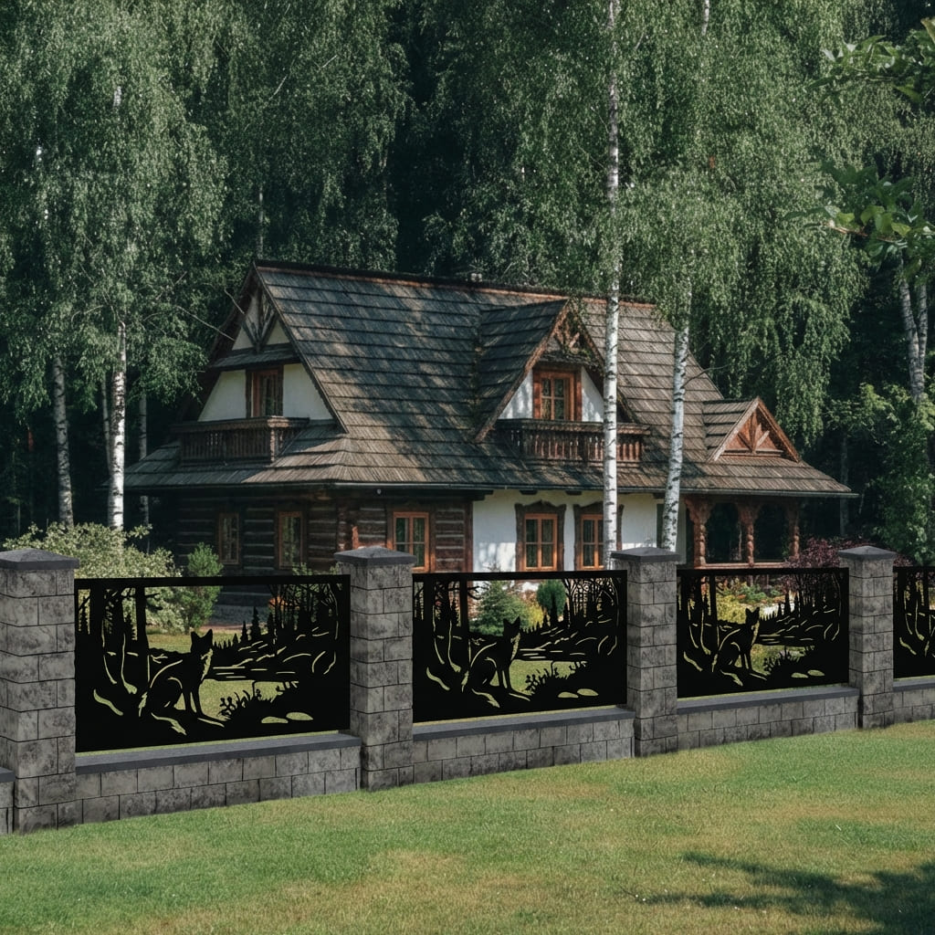 Panel Ogrodzeniowy Metalowy – Motyw Lis w Lesie – Wzór "2067" – Dekoracyjny Panel Ażurowy – Cięcie Laserowe na Wymiar