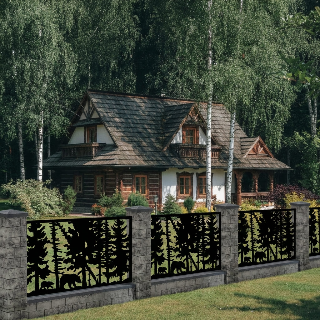Panel Ogrodzeniowy Metalowy – Motyw Niedźwiedzie w Lesie – Wzór "2042" – Dzika Natura – Cięcie Laserowe na Wymiar