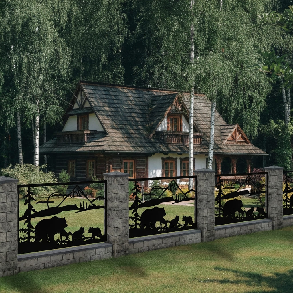 Panel Ogrodzeniowy Metalowy – Motyw Niedźwiedzie w Lesie – Wzór "2052" – Dzika Natura – Cięcie Laserowe na Wymiar