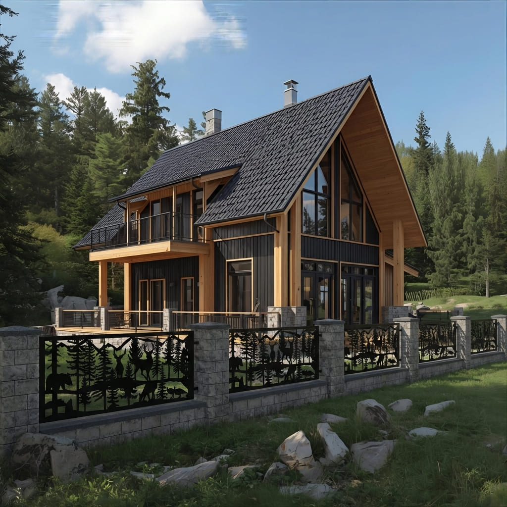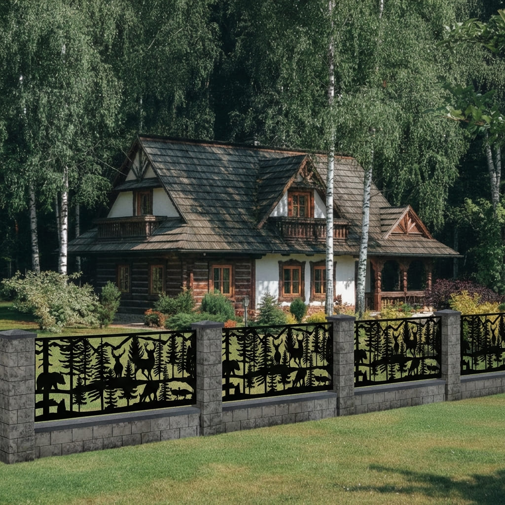 Panel Ogrodzeniowy Metalowy – Sceneria Leśno-Górska (Niedźwiedź, Jeleń, Sarna) – Wzór "2023" – Panorama Nature – Cięcie Laserowe na Wymiar
