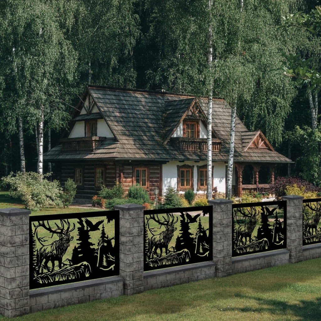 Panel Ogrodzeniowy Metalowy – Wzór "2166" (Król Wyżyn) – Motyw Jeleń, Orzeł i Las – Kolekcja Natura – Na Wymiar